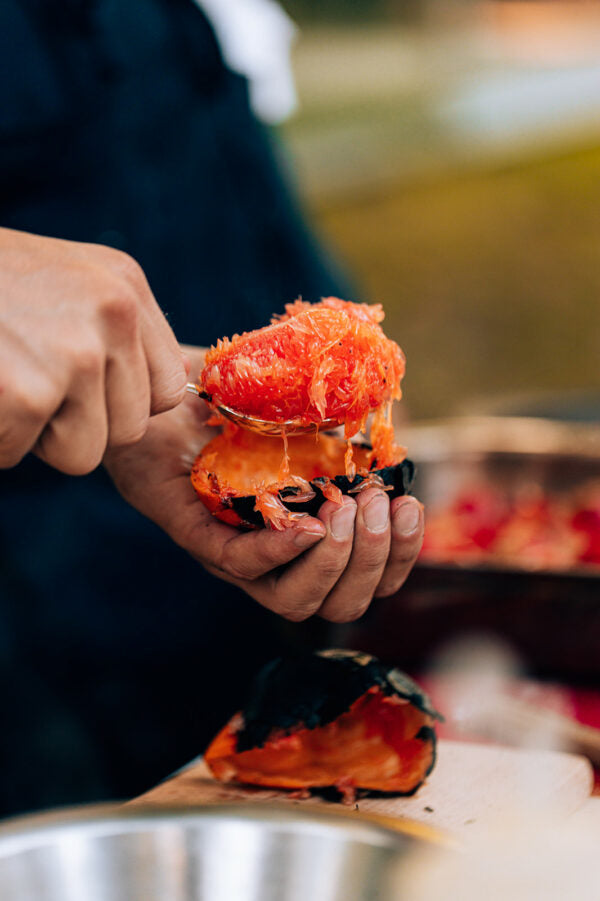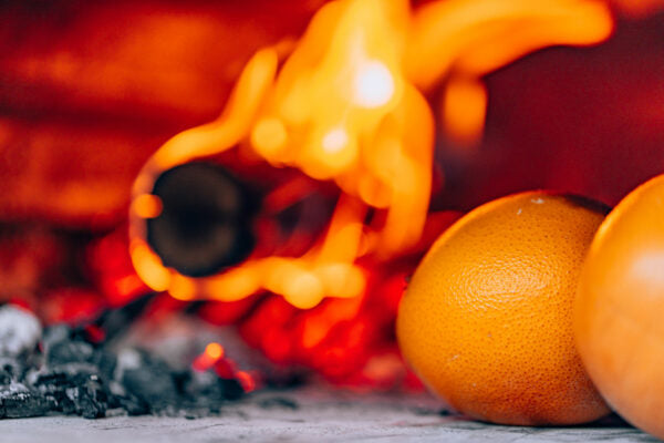 5. Na 20 tot 30 minuten haal je de pompelmoes eruit met een handschoen. De pel is mogelijks gedeeltelijk zwart geblakerd, maar dat vormt geen enkel probleem. De geur van de pompelmoes is onweerstaanbaar.