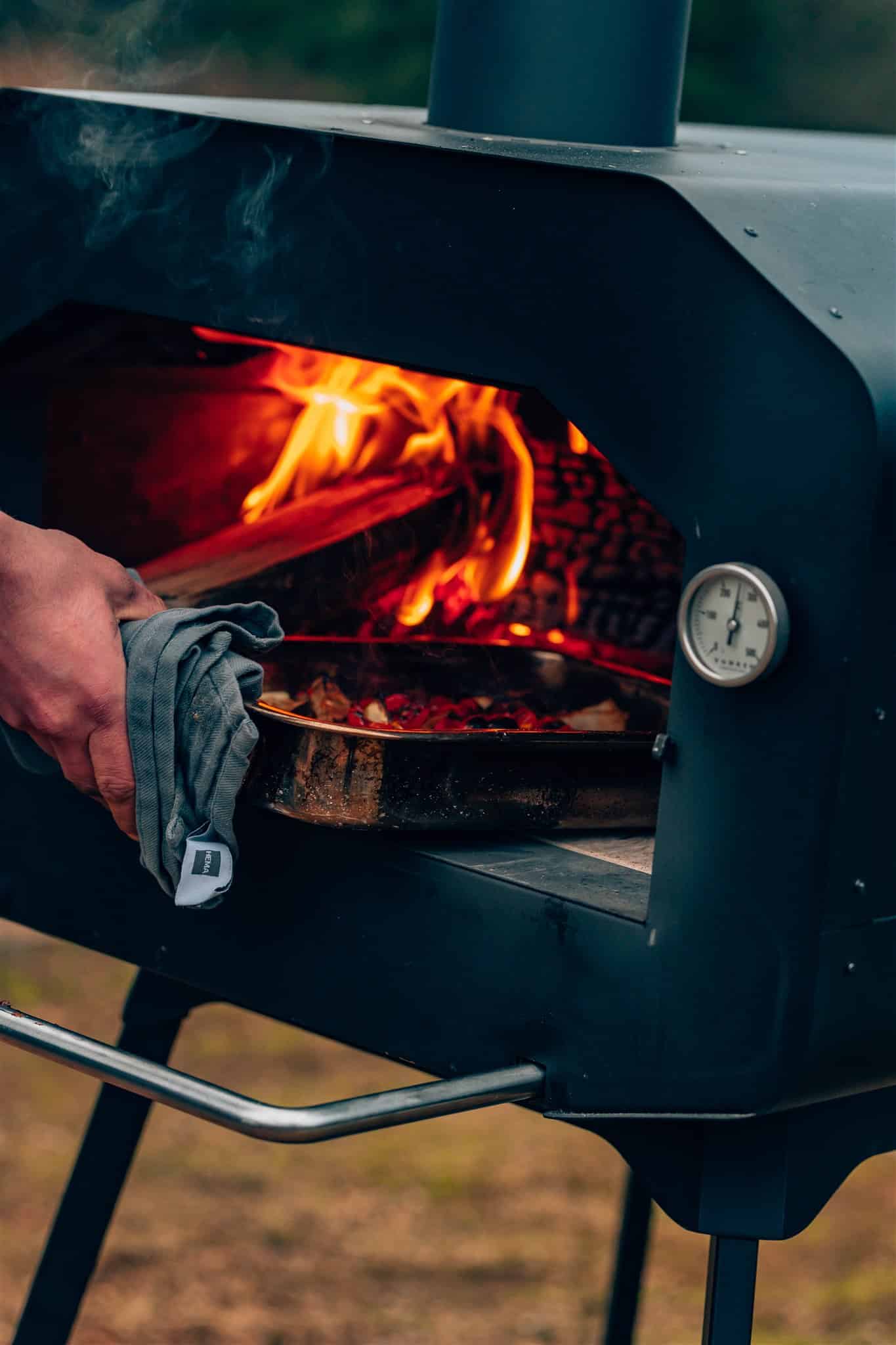 Great, that's very easy. You can check again whether you want a fast and crispy result (you get that by baking with flame and don't put a stainless steel oven dish overcrowded in your Vonken), or rather slow results (you get that by waiting until the flame goes out). and a filled oven dish slides onto the baking floor at a temperature that is not too high).