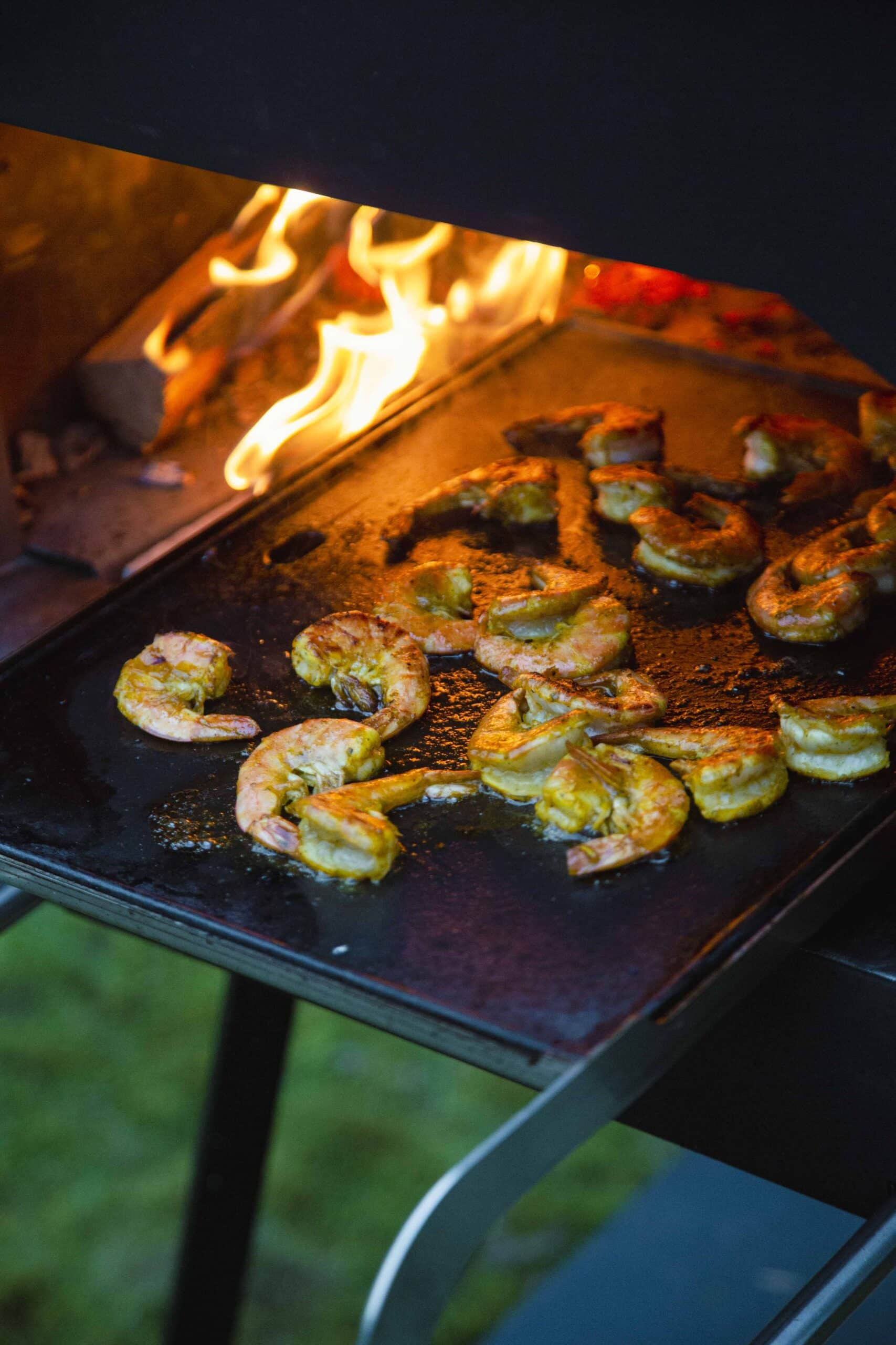 You can either use a stainless steel casserole dish with a piece of meat in it that you slide under the hot flames (but if you're making a roast or a piece that takes a little longer, it's recommended to wait for the flames to die down so the meat does not burn too quickly), or you can work with our grill set . The great thing about the grill set is that it is cooked on two sides: a hot cast-iron plate at the bottom and the hot flames at the top. Fish and meat sear on both sides, so that they retain maximum juiciness and tenderness.