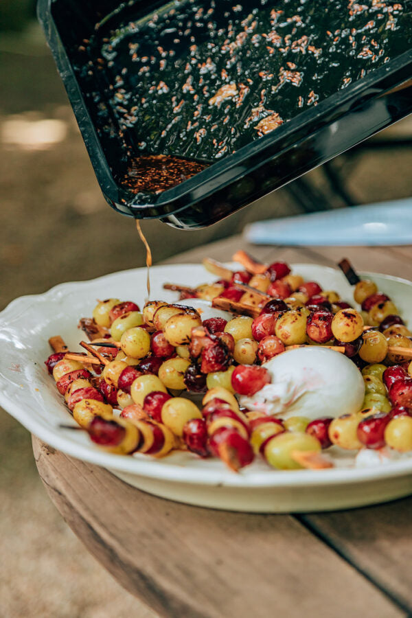 This recipe is inspired by a recipe by the popular chef Ottolenghi. The recipe has been adapted for the wood oven. Thanks to the wood aroma, the sweet notes of the grilled grapes come into their own even more. The...
